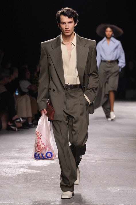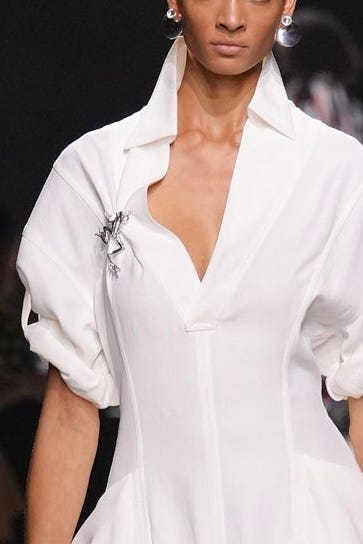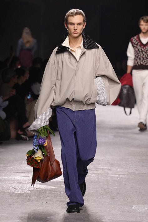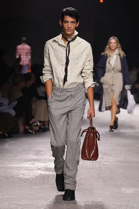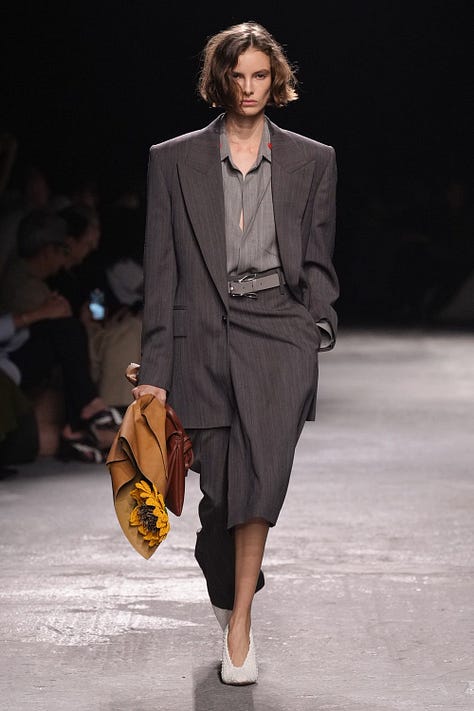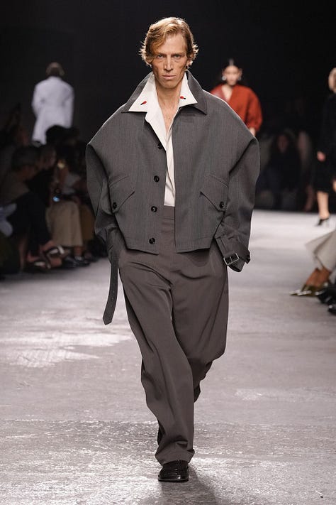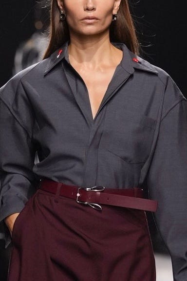 Matthieu Blazy se v Botteze cítí stále více jako doma. Takové šťastné spojení DNA designéra a módního domu je v dnešní době téměř zázrakem. Jeho kolekce je ukázkou toho, jak by měla vypadat dospělá, elegantní móda s dávkou humoru a hravosti. Už samotná pozvánka na přehlídku, která měla podobu koženého náramku se zapínáním ve tvaru hlavičky králíčka, naznačila, že show ponese veselý a zábavný tón (*Všimněte si detailů na páscích kabátů nebo kalhot).