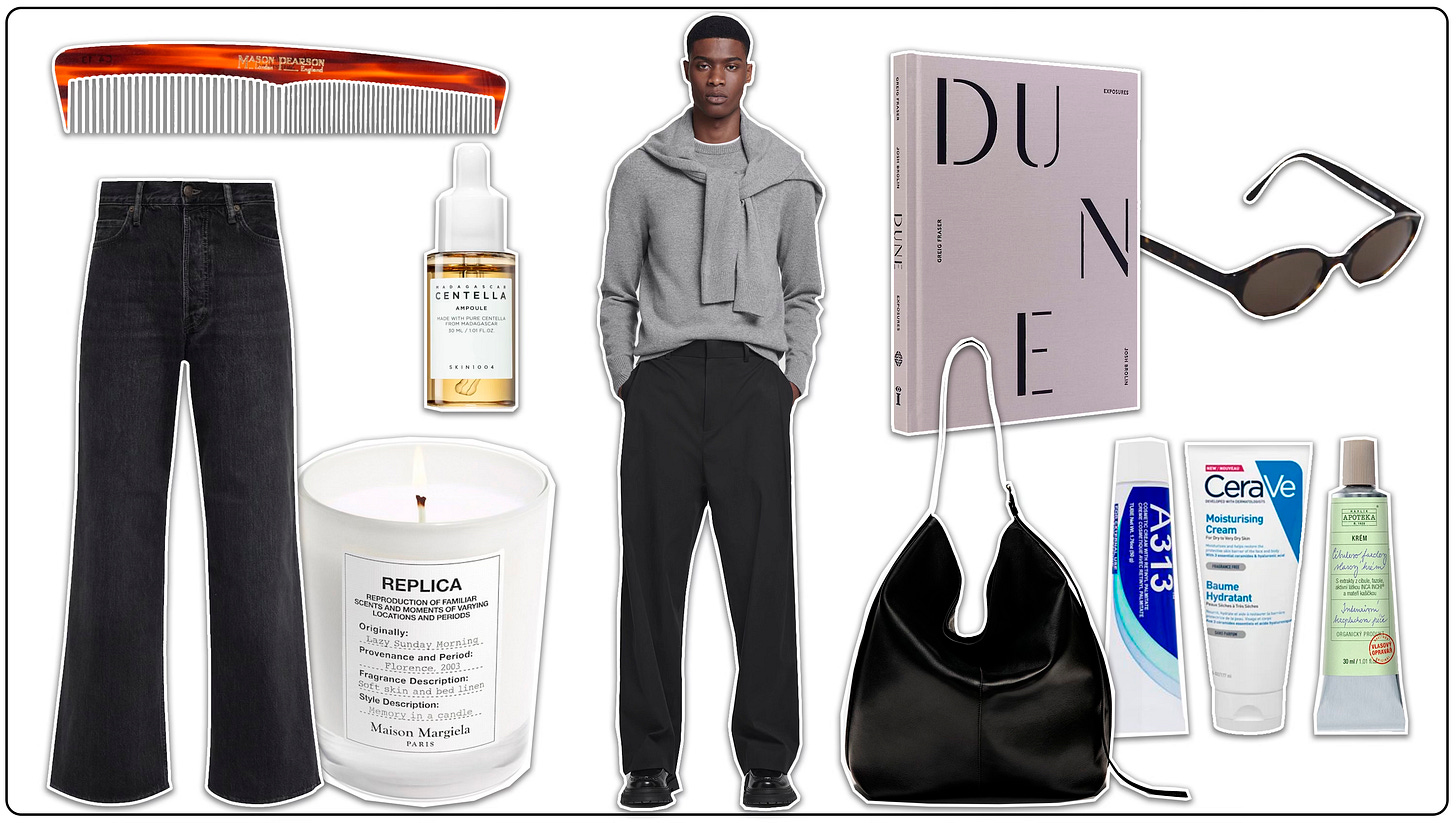 Musím uznat, že tento retail therapy moment mě překvapuje svou autenticitou... Shrnuje věci, které na první pohled spolu vizuálně moc neladí, ale rozhodně za to stojí. Například cibulovo-fazolový vlasový krém od Havlíkovy Apotéky. Pokud chcete zlepšit kvalitu vlasů a dodat jim sílu, neváhejte sáhnout po tomto produktu. V kombinaci s hřebenem od Mason Pearson máte vyhráno. A jestli tě, stejně jako mě, už několik let trápí akné, doporučuji vrátit se k základům: jednoduchý hydratační krém od CeraVe a pro podporu hojení a obnovu kožní bariéry Centella od Skin1004. Na noc pak A313. Není to sice nejvíc fashion a sexy produkty, ale fungují zázračně!